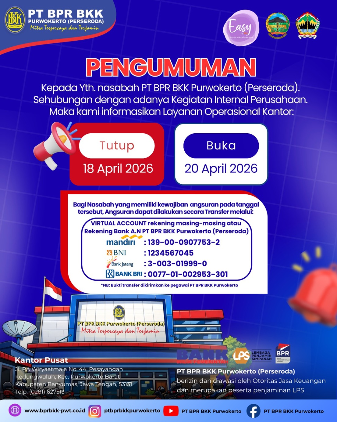 Layanan Operasional Kantor tanggal 18 April 2026 dan Layanan Operasional di Gor Satria pada Hari Minggu tanggal 19 April 2026 TUTUP,
